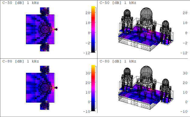 For mosque design, we are focused on speech intelligibility and clarity. The reverberation time for receiver in the middle of room is around 1.25 s. The clarity for speech (C50) is around 0.7 dB in entire room, and the clarity for music (C80) is around 3.3 dB in entire room