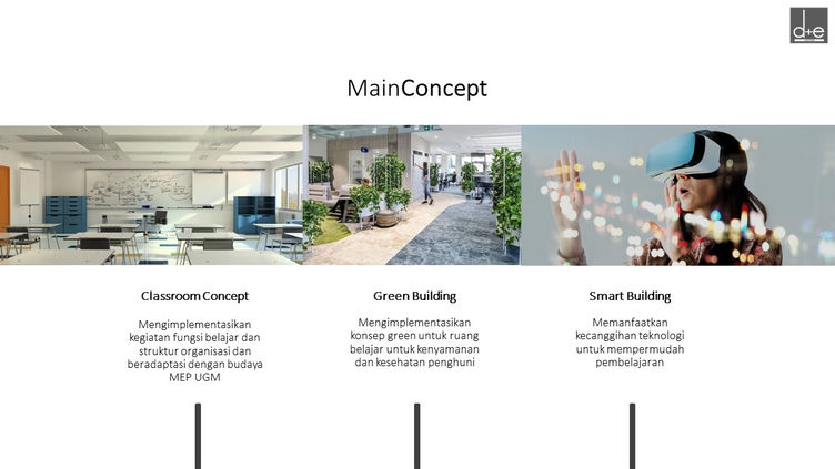 Despite of that, there are 3 Main Concepts that we used to designed the building, those are Classroom Concept, Green Building, and Smart Building. Classroom concept implement learning function activities and organizational structure and adapt to the culture of Master of Economics Development Gadjah Mada University with green spaces for study for the comfort and health of the users and also take advantage of technological sophistication to facilitate learning. We combined that 3 concepts with Gadjah Mada University building regulations
