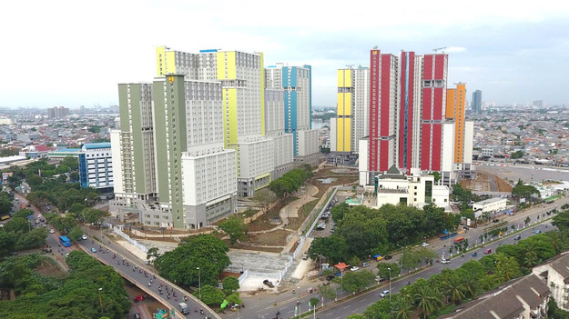Wisma Atlet Kemayoran provides green open space of 51,818.76 m2 or 62.99% of the total land area, equipped with Communal Plaza between towers. The green area of the landscape is filled with tropical plants that come from local nurseries, due to reducing the carbon footprint.